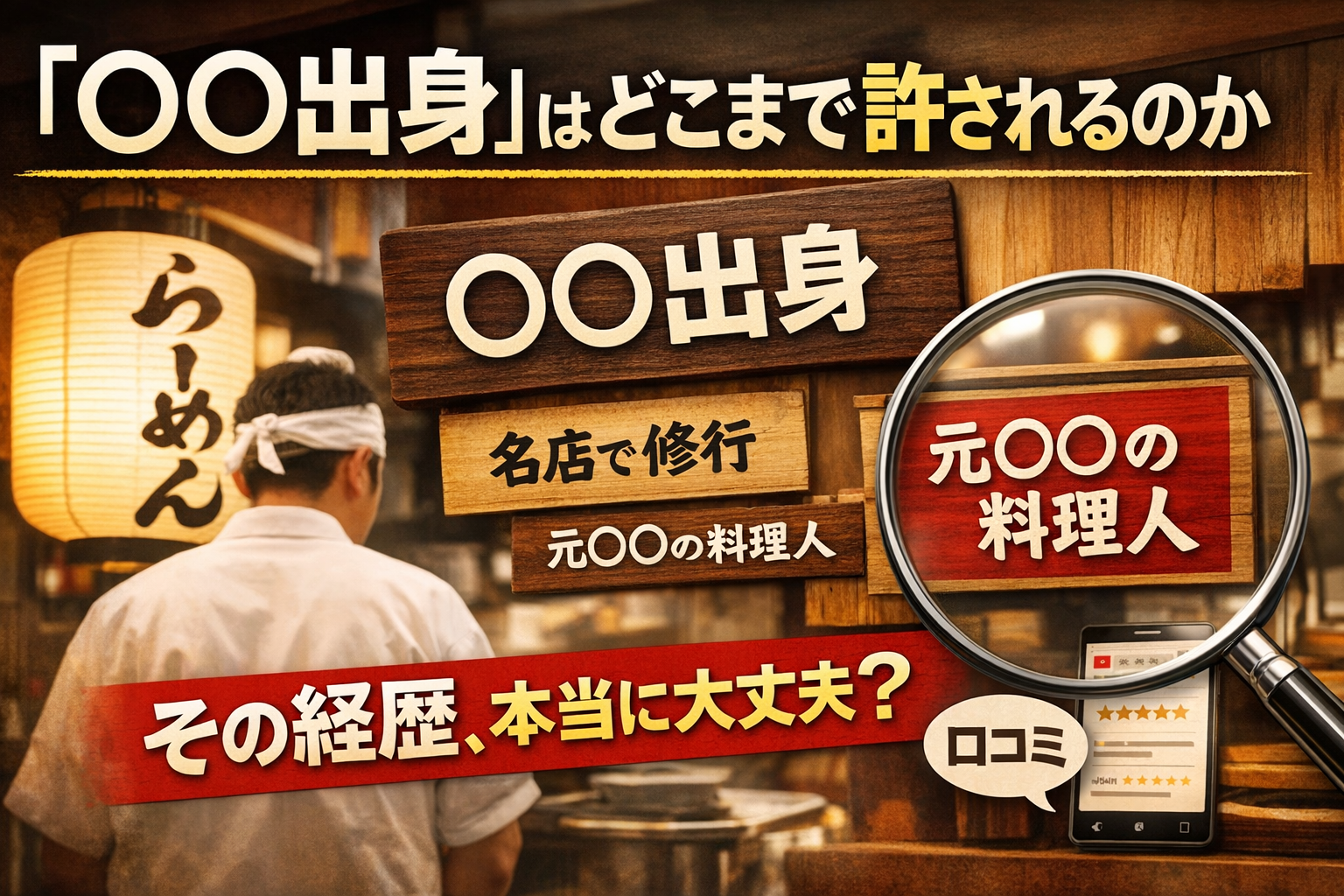 飲食店では、「○○出身」「名店で修行」「元○○の料理人」といった言い方は、珍しいものではありません。消費者にとっても、それは味や技術への期待を短時間で形成する便利な手がかりです。しかし、いまはSNSや口コミサイトによって、店のプロフィール文や看板の一言が、そのまま集客装置になり、ブランドの一部として流通していきます。だからこそ、単なる自己紹介に見える表現でも、実際には他人の信用にどこまで依拠しているのかが厳しく問われる時代になっています。