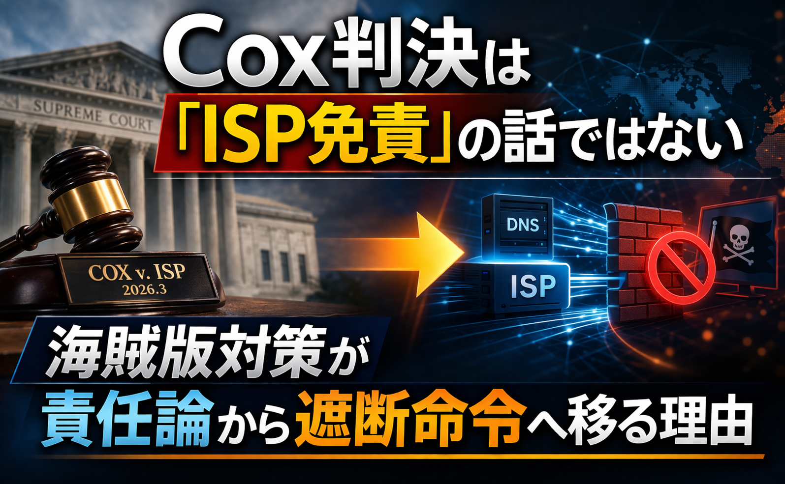 私の見立てでは、Cox判決は「ISPを救った判決」としてだけでなく、「著作権執行をより明示的なインフラ規制へ押し出した判決」として記憶される可能性が高いです。サービス提供者にとって短期的には勝利でも、中長期では、より直接的で構造的な遮断義務を招く入口になり得ます。権利者側が失ったのは一つの訴訟理論であって、執行強化の意思そのものではありません。これからの本当の論点は、ISPに責任があるかどうかではなく、国家と裁判所がネットワーク層にどこまで介入してよいのか、という点に移っていくはずです。